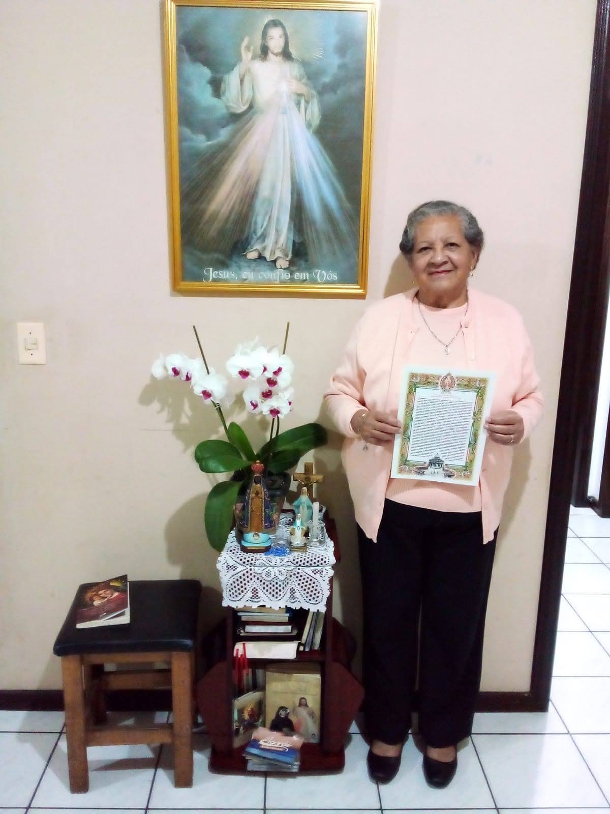 Sua fé foi um dos pilares mais fortes de sua existência. Católica Apostólica Romana e Mariana, como ela se definia, viveu sua espiritualidade com entrega e devoção até os últimos dias. Devota de Jesus Misericordioso, encontrava na oração, especialmente no Santo Rosário, uma fonte inesgotável de força e paz. Foi catequista, participou de movimentos religiosos, cantou, compôs e evangelizou com alegria, espalhando sua fé não apenas em palavras, mas principalmente em atitudes.