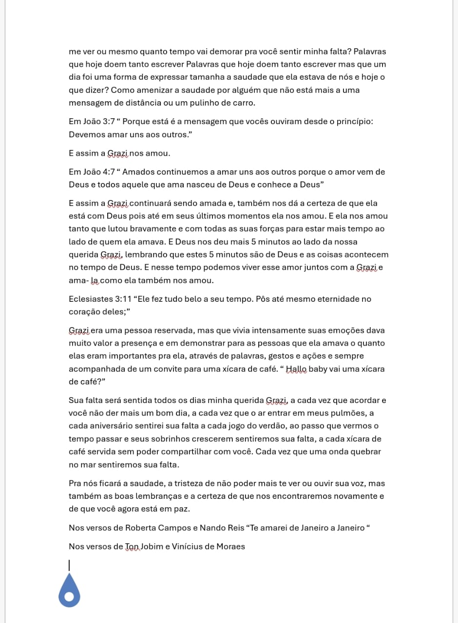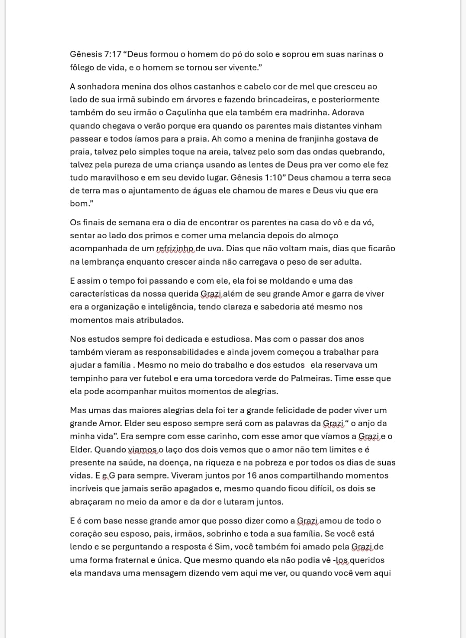 “Amados, continuemos a amar uns aos outros, porque o amor vem de Deus.” E é nessa certeza que encontramos algum consolo, a de que ela permanece envolvida por esse amor maior, e que até em seus últimos momentos foi capaz de nos ensinar sobre força, coragem e fé. Lutou bravamente, com todas as suas forças, desejando apenas mais tempo ao lado de quem amava. E Deus, em sua infinita sabedoria, concedeu aqueles minutos preciosos, instantes que hoje guardamos como eternos, lembrando que tudo acontece no tempo certo.