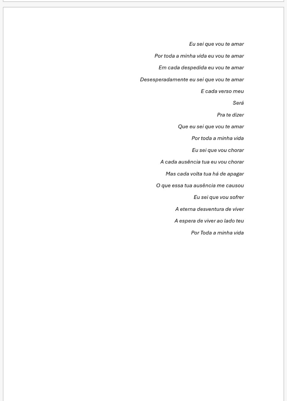 Eu sei que vou te amar, por toda a minha vida eu vou te amar. Em cada despedida eu vou te amar. Desesperadamente eu vou te amar, e cada verso meu, sera pra te dizer, que eu sei que vou te amar, por toda a minha vida, eu sei que vou chorar, a cada ausencia tua eu vou chorar. Mas cada volta tua ha de apagar, o que essa tua ausencia me causou, eu sei que vou sofrer, a eterna desventura de viver, a espera de viver ao lado teu. Por toda a minha vida!