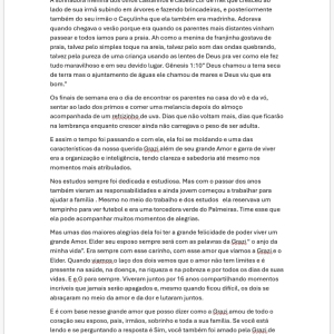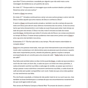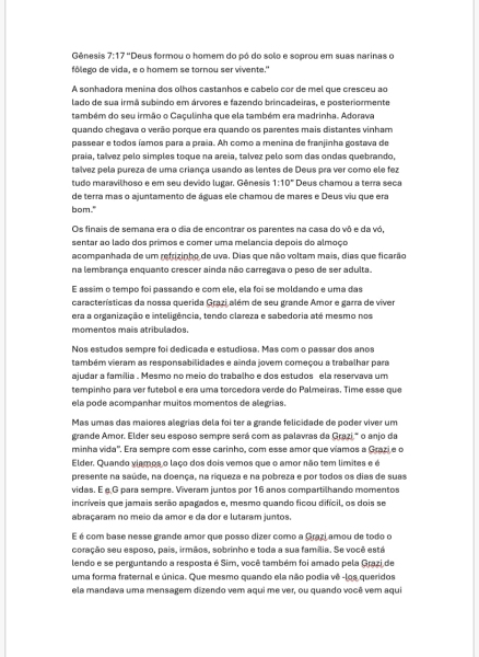 AndersonMinha princesa! Foste minha aia no casamento, não está certo isso. Te ver partir me faz rever uma vida. Que sorte poder ter convivido contigo. Ver a tua luta e a tua resiliência me faz querer ser melhor. Que sorte aprender o que é viver o amor com o teu esposo. Que sejas recebida com muita festa nos braços dos nossos no céu. Te amo pra sempre.